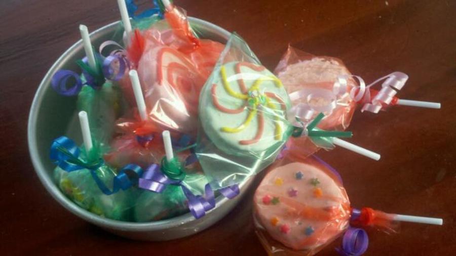 Cake lollipops made out of vanilla sprinkles cake bread and white chocolate coating (and some have shredded coconut (i.e. top right)) Decorations are royal icing and sprinkles.
