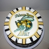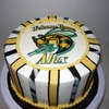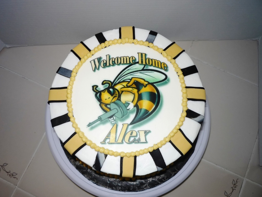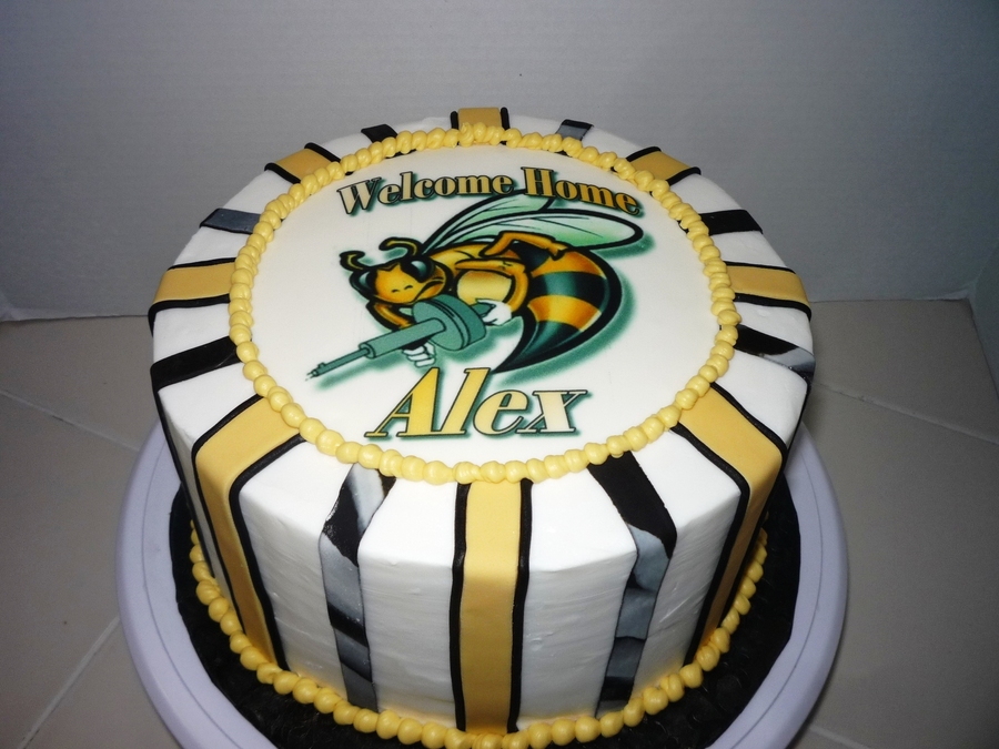 This was a welcome home gift for a friend's husband. He just returned from a 5 month deployment for a humanitarian cruise with the Navy Sea Bees. Chocolate WASC w/cookies & cream filling. Buttercream with fondant stripes in black, marble & yellow. Edible image logo.