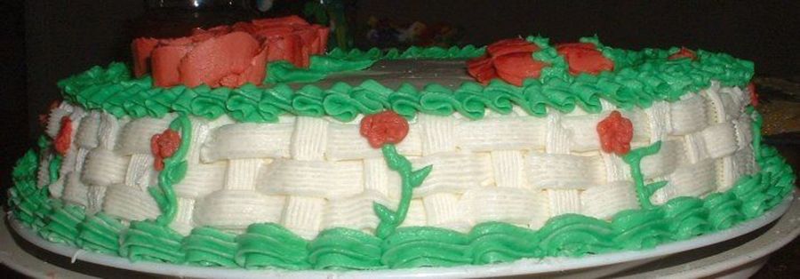 A side view: Pay no attention to how skinny the cake is. I had a little trouble with the recipe, and no time/resources to make a second layer. I made several mistakes on the basket weave (my first time) so to cover them up I made cute little flowers. I would have made drop flowers but I seem to have lost my only drop flower tip, it would have been too big anyways. And my star tip was covered in green from the bottom border. I picked up a smaller drop flower tip today when I was out, so next time I decide t
