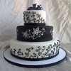 Black and white piped scrolling in royal icing. Purple gumpaste orchids. The fondant is all MMF. However, next time I need to cover a tier in black I think I will just buy it premade. TFL!