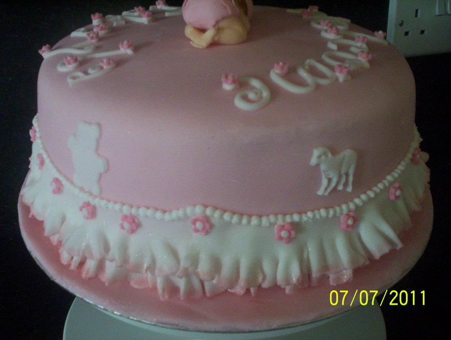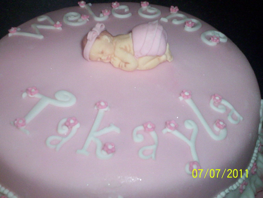 Vanilla cake with buttercream, covered in fondant with fondant/gumpaste accents. Made for the arrival of a freind's new baby girl. I really enjoyed making this cake. TFL