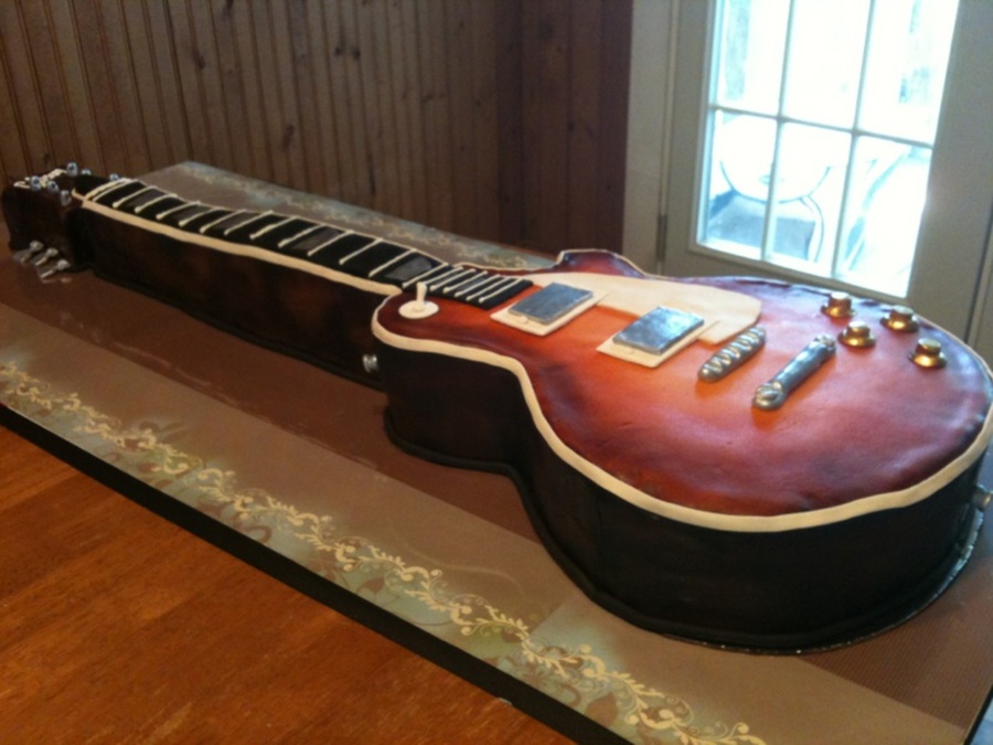 This is a Gibson Les Paul cake that I did for a friend's 50th birthday party. It's a full-size 1:1 replica of a Gibson Les Paul that he owns. Overall, I'm happy with the results, although I'm an amateur and had a lot of issues (especially with the neck, which isn't even close to level). Lessons learned: 1) Don't tackle a cake this big until I learn a lot more; 2) Don't ever buy Satin Ice fondant again as it's a real pain to work with; and 3) 14x22" cake pans are tricky to bake with.