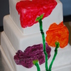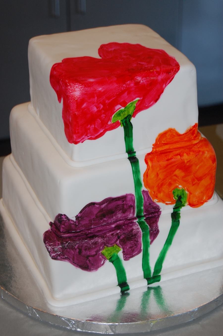 3 tier cake with hand painted flower design, based on a cute little gift bag I found--thought it would make a cute cake, too. Tangy lemon cake with tart raspberry sauce and raspberry SMBC. Fondant, painted with food coloring.