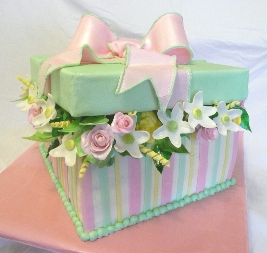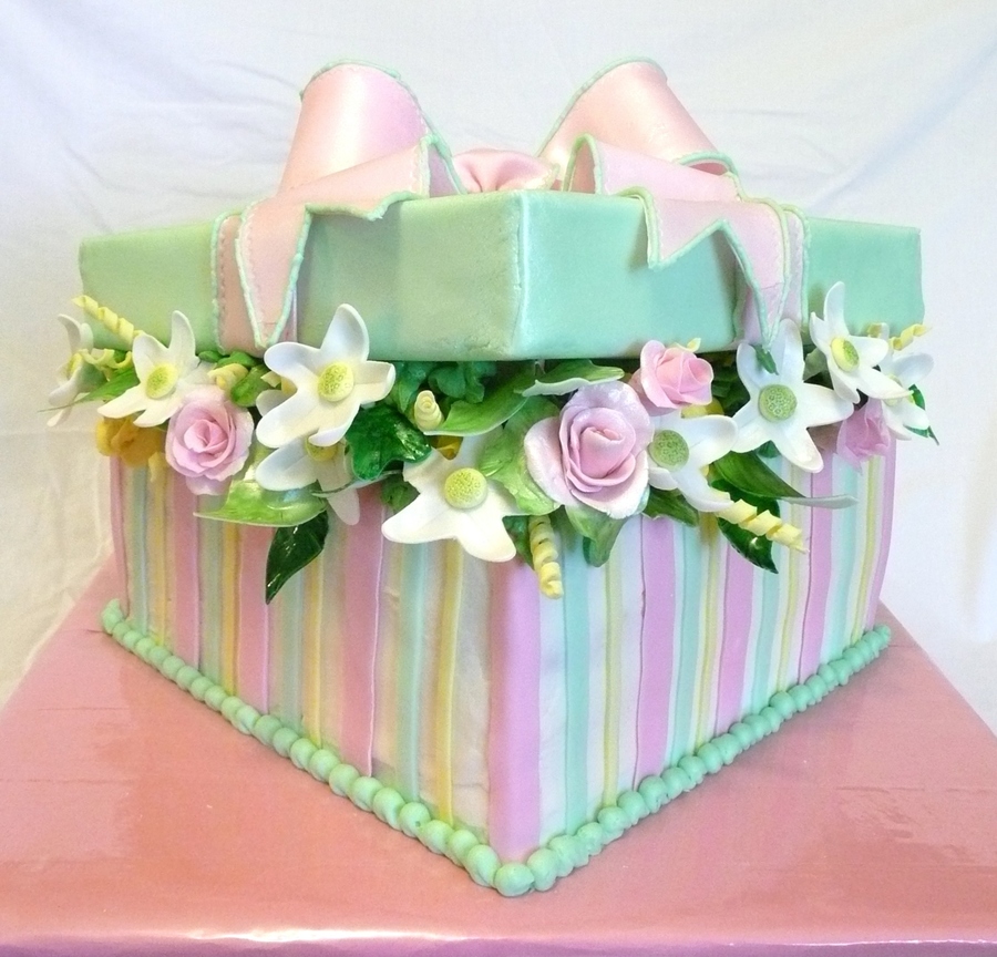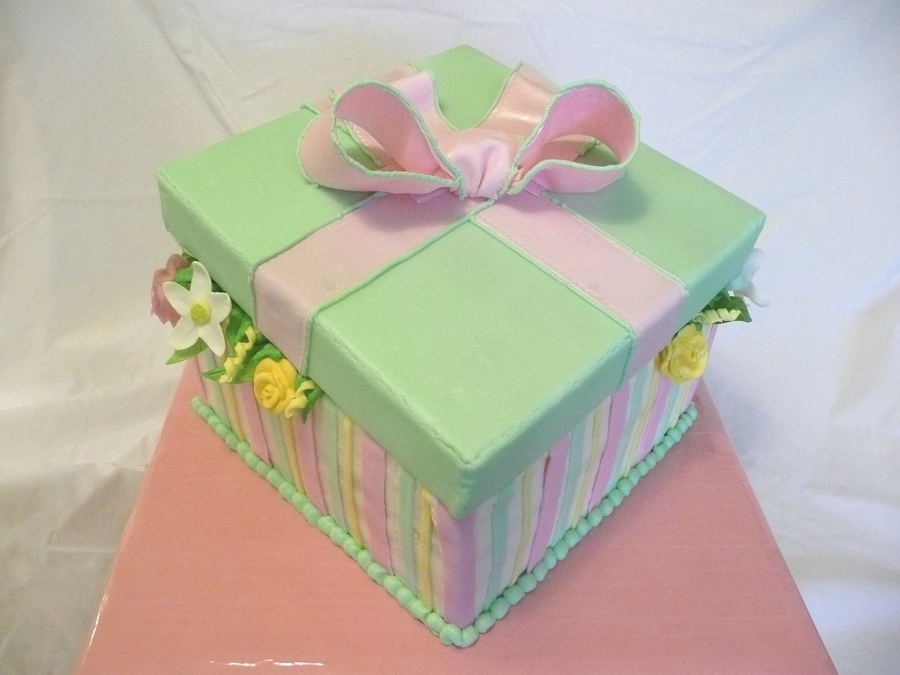 This was a fun cake! Thank you to everyone on CC for the idea and the "how-to" for the bow, this was my first bow. The top of the box is a dummy cake as I didn't need to have that many servings. Bottom of cake is BC with fondant stripes.