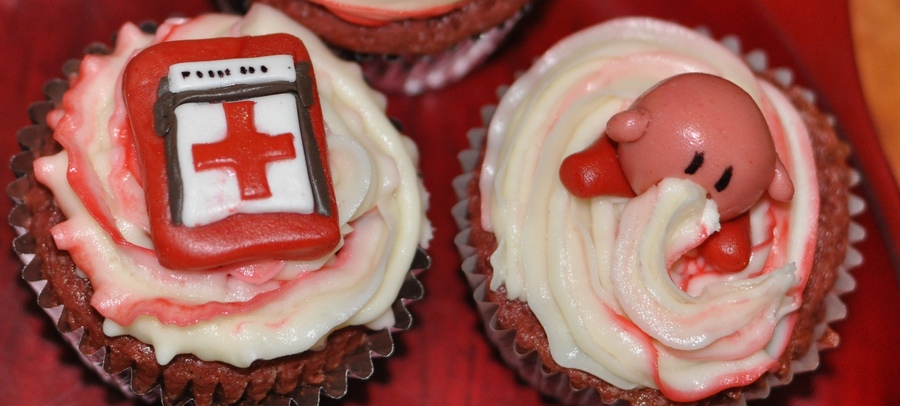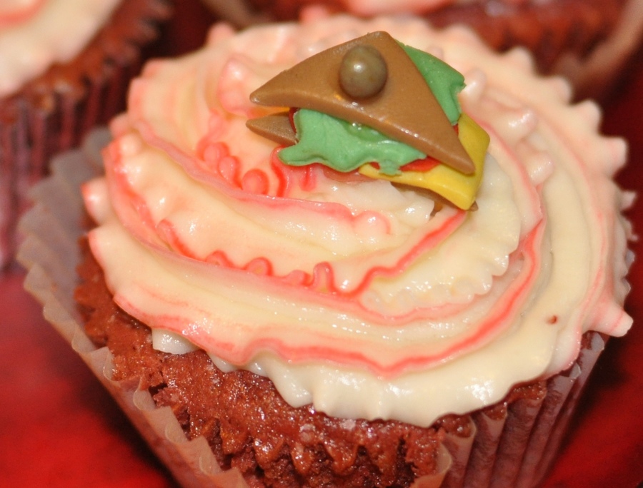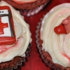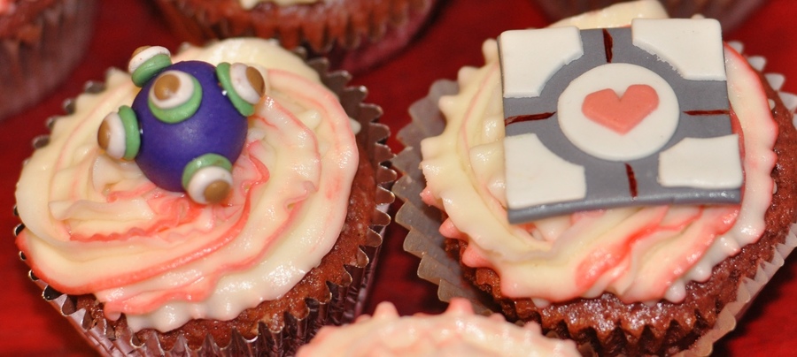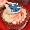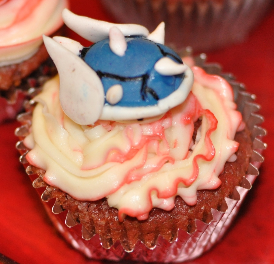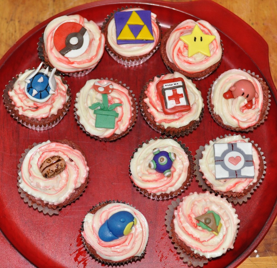 Red Velvet Cupcakes for my brother's gamer themed birthday party. Gumpaste figures: Blue Spiked Shell (Mario Kart), Pokeball (Pokemon), Triforce symbol (Legend of Zelda), Star (Mario), Kirby (Kirby), Piranha Plant (Mario), Med Pack (Left for Dead), Brain (Psychonauts), Katamari (Katamari Damacy), Portal Cube (Portal), Klonoa Cap (Klonoa), Sandvich (Team Fortress 2)
