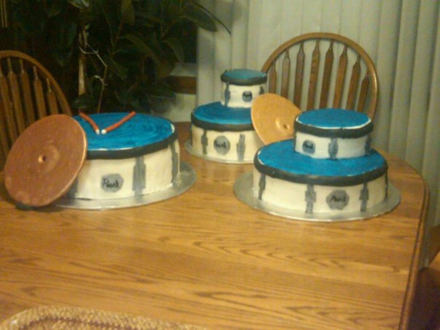 Set of drums to match a drum set for my brothers senior recital. Various size cakes covered in fondant. Drum hardware is all fondant pieces as well. Tops of drums are brushed with blue cake glitter. Cymbals are cake boards with center hole cut out and covered in yellow fondant. Cymbals were also brushed with gold/bronze cake glitter to match true color