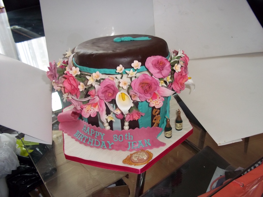 This was for a family friend's 80th birthday. I took the inspriation from various people here on CC but particularly "Lingin" wonderful hatbox cake so many thanks to all for your kind sharing of idea's. This was 8 inch stacked rounds of vanilla, lemon sponge filled with strawberry and buttercream. All the flowers are made of gumpaste and the cameo brooch at the front. TFL