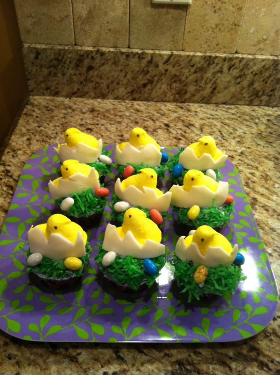 I made these cupcakes for an Easter dessert auction at work from a recipe I found on the Food Network website. I used fondant for the eggshell, Peeps, jelly beans and shredded coconut colored with food coloring for the grass.