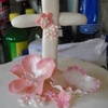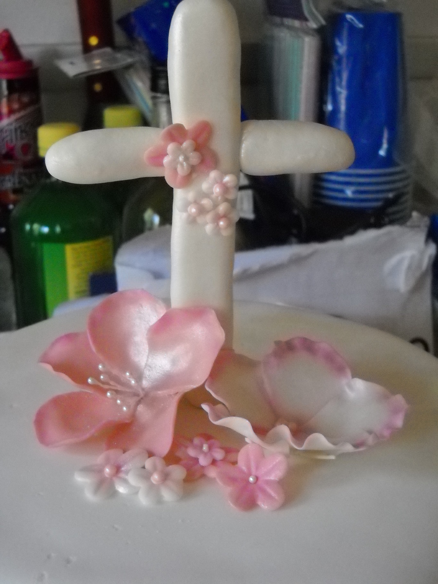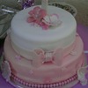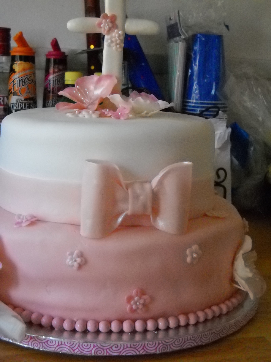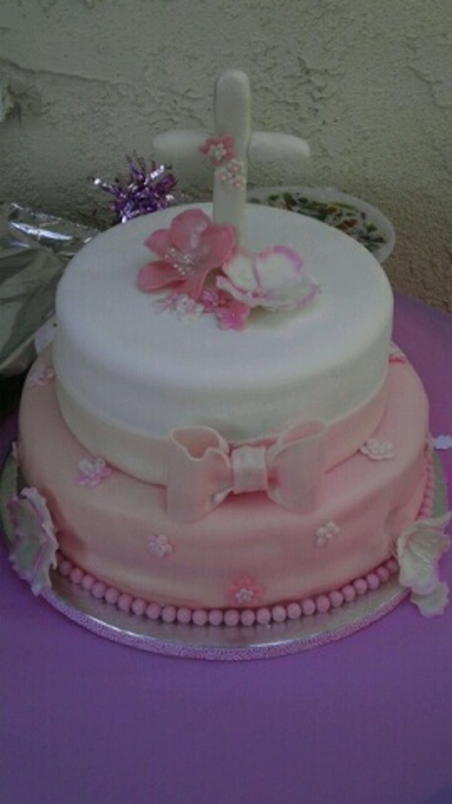 Two-tier cake for a friend's daughter's baptism. WASC cake with cookies and cream filling on bottom tier and strawberry buttercream filled top tier. Fondant covers, gumpaste/fondant flowers, fondant bow. I learned SO MUCH doing this cake -