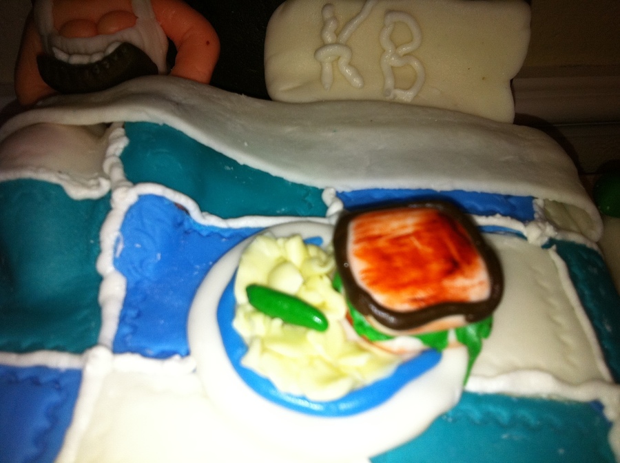 This is a cake that i made for my aunt. Her favourite thing to do is to lay in bed and read. All decorations including head/foot board are MMF. The bed itself is chocolate cake.