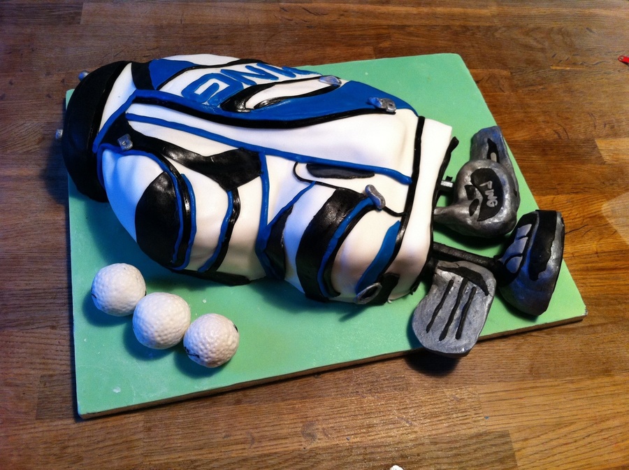 A sponge cake for a golf tournament. All edible except the shafts of the golf clubs... all accessories fondant except the clubs heads and golfballs which are rice-krispie cakes covered in icing.