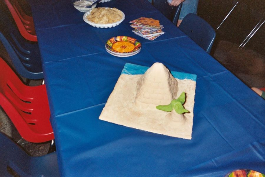 This is a cake that I carved to a 3D Pyramid then covered in fondant. I used granulated sugar tinted tan to make the "sand" covering the fondant, then marbelized blue and white fondant for the Nile river