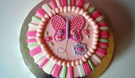 Bottom tier vanilla with plain buttercream and MMF on top, Top tier dark chocolate cake with chocolate buttercream and MMF on top. MMF teardrop shapes.