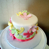 A 5" cake made for a birthday party. It was a 5" white almond cake with blackberry filling and white chocolate cream cheese frosting, covered in fondant, and decorated with gumpaste flowers. Thanks for looking!