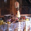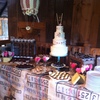 This wedding cake was the centerpiece of a larger dessert buffet. The wedding was held in a barn and the theme was modern vintage/shabby chic. The bunting and flowers were made of rice paper and, other than the topper, everything was edible. Cake was vanilla bean filled with passionfruit curd, finished with IMBC.