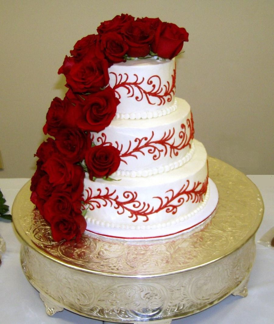 can you tell me a little bit more abou this cake? Looks like buttercream base and fresh roses?? Did you pipe the red scrolls on? Looks stunning