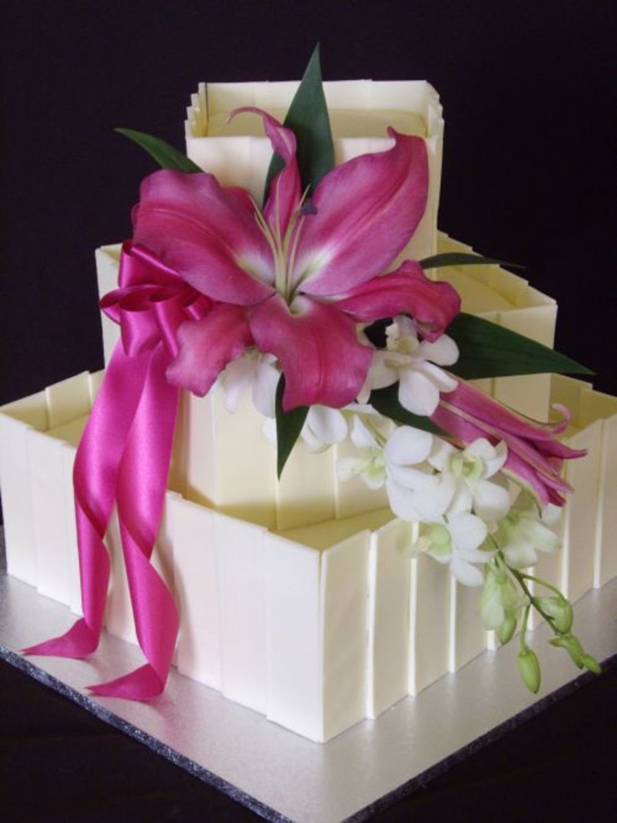 This cake is decorated with fresh flowers which are individually wired and taped together. I placed two plastic posy picks into the cake so the fresh flower stems would not make contact with the actual cake.