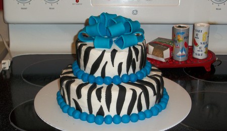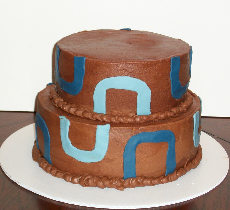 Decorated to match the bedding. White cake, chocolate icing, and fondant accents.