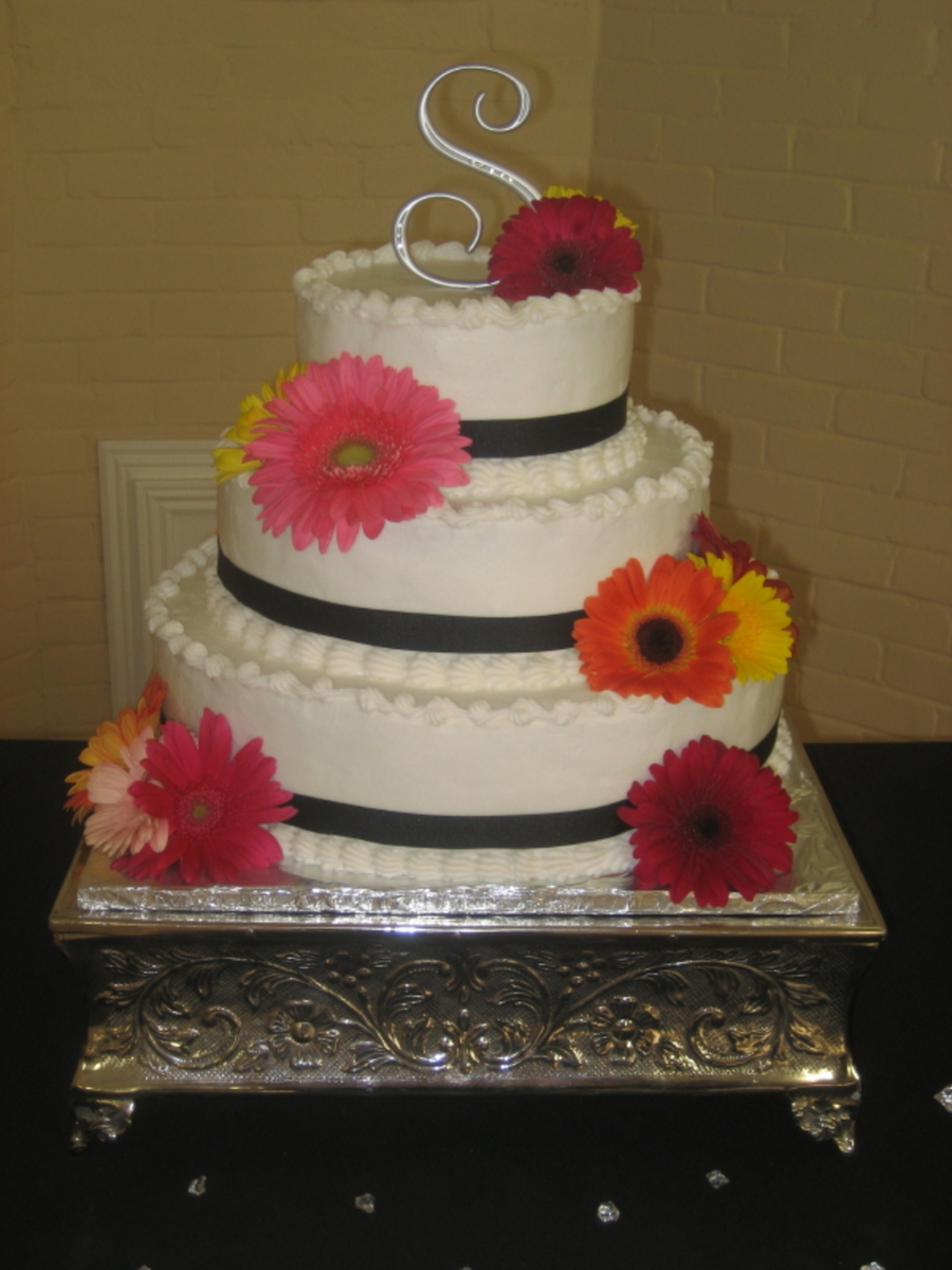 My first wedding cake! Vanilla and chocolate with raspberry filling and fresh gerber daisies.