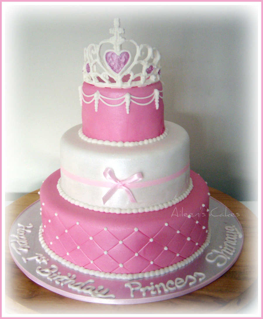 1st birthday Princess 3 tier cake. The bottom tier is a 10 inch vanilla sponge rainbow cake with vanilla buttercream, the middle and top tiers are 7 and 4 inch white chocolate mud cakes with white chocolate ganache filling. The cake is iced in fondant with edible shimmer dust over it all, quilt embossing, satin ribbon and royal icing piping. The crown topper is hand made from royal icing.