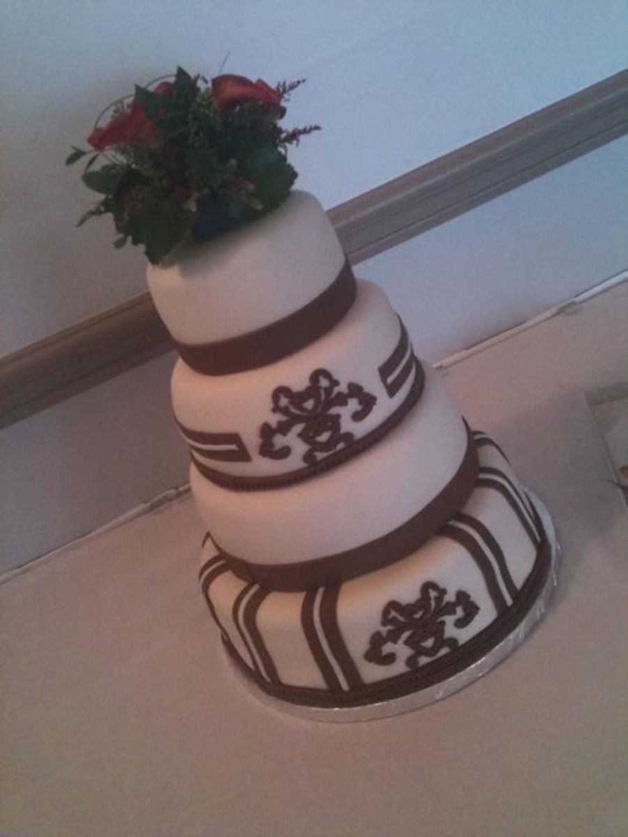 Four tier wedding cake with Fresh flower topper. Chocolate, Vanilla, and Carrot cake covered in fondant. Used wiltons new chocolate fondant for the decorations, and it tastes like a tootsie roll!