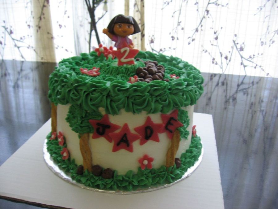 Made this cake for a little girl turning 2. I found a few pictures of cakes people had done incorporating Dora and kind of combined them with a few ideas of my own. The Dora is a plastic topper off of a play-doh bottle, everything else is edible.