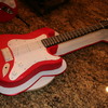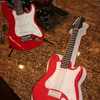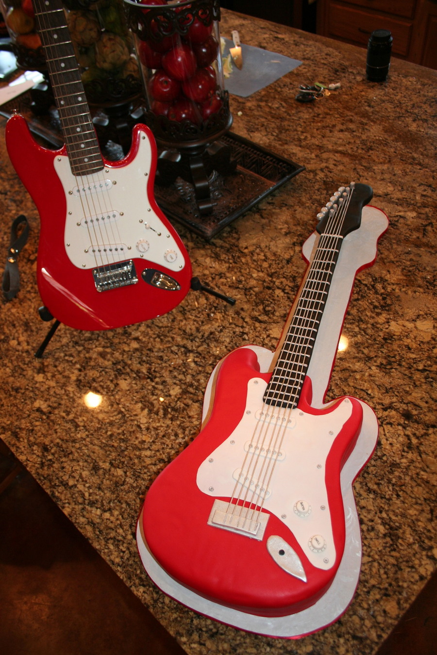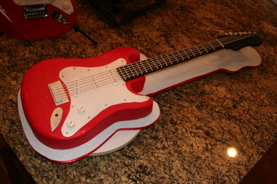 Life-sized, fondant covered, sculpted cake modeled after my son's electric guitar. Neck was a piece of Poplar wood, cut to size, iced and covered in fondant. Strings were spaghetti painted with silver dust in lemon extract.