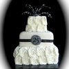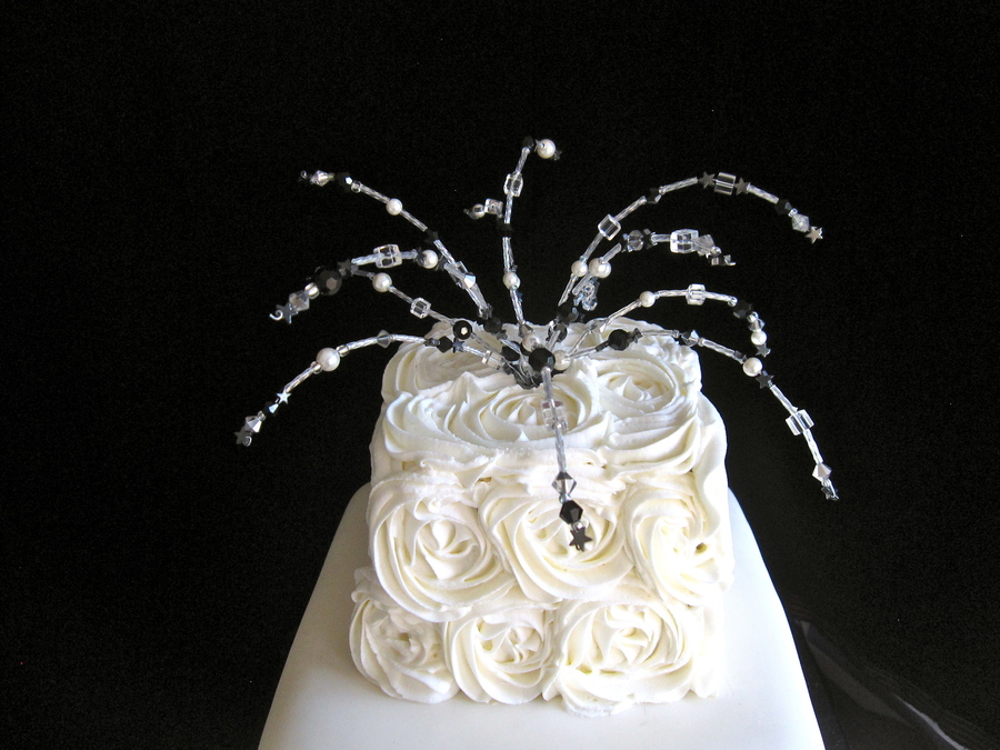I was asked to make a cake to celebrate the 25th anniversary gala event of a chamber music society. Their invitations had fireworks on them so I created the 'firework' spray out of crystals and beads in order to compliment, not overpower the rosettes. Bottom tier (10") is chocolate with raspberry ganache, top two tiers (8" & 4") are tuxedo cake with chocolate ganache. I am always grateful to i am baker for the wonderful technique of the rosette cake. It's such a simple design but so beautiful! TFL!