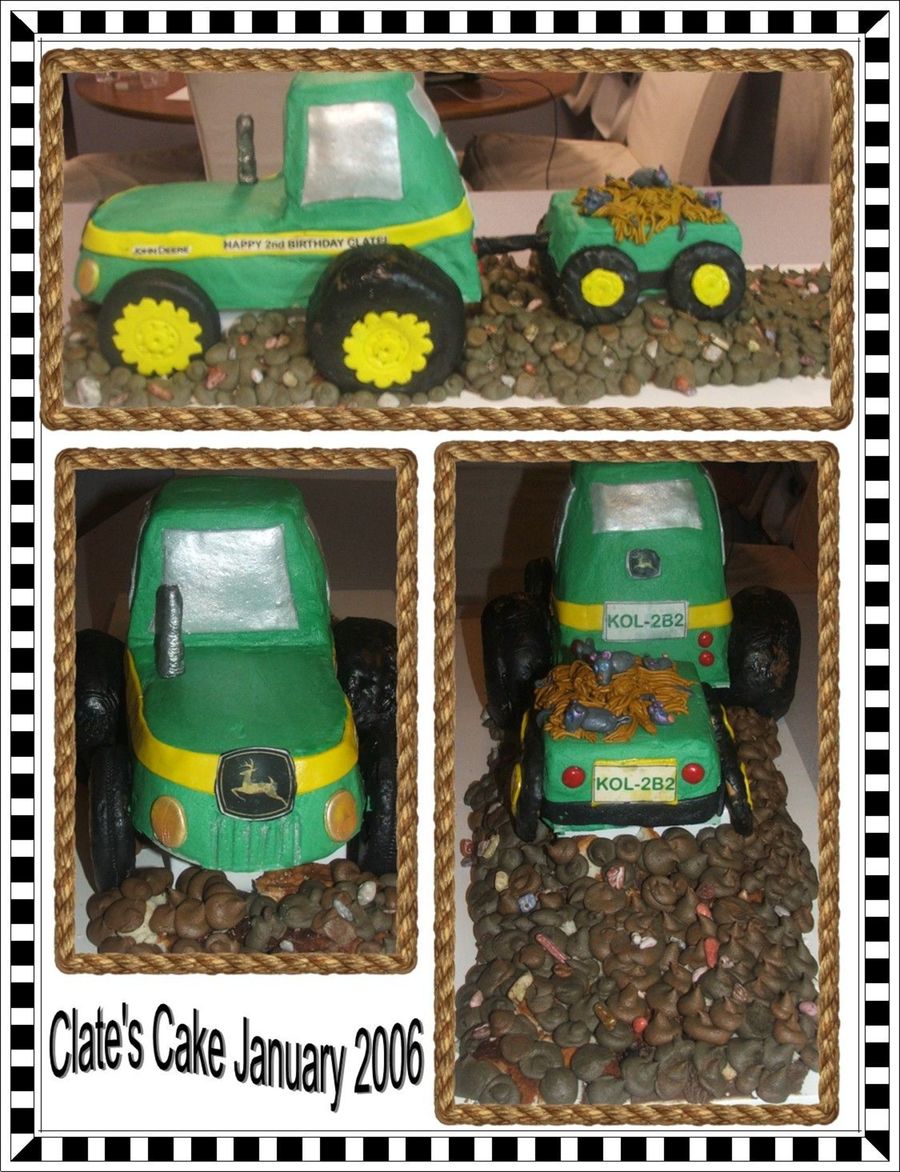 This is a John Deere tractor cake for a two year old little boy. It was inspired by one of Boween's cakes. (Thanks for the idea!) The little boy loves rats so the trailer has rats in the hay. I really enjoyed making it.