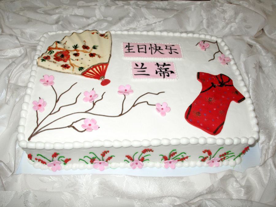 This cake was for an 8 year old girl that was having an oriental party. Very short notice on this cake. The symbols mean Happy Birthday Randi. I found how to write this on the internet so hopefully that's what it says.