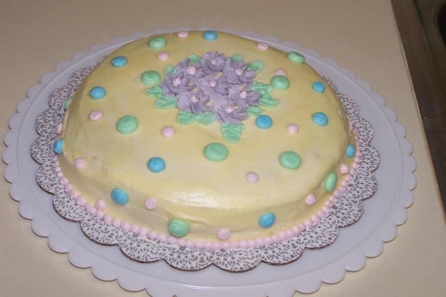 Single layer 8 in lemon cake, torted/filled with lemon curd, lemon BC icing. I added lemon curd to the BC to thin & flavor it, but it's obviously too thin--you can see through it--lol! Instead of the Wilton clowns, I opted to practice the dots and swirl flowers in class. My kids are terrified of clowns, so I don't plan to use them anyway. I need lots of practice!!! Also should've used my Magic Line pan with the nice straight sides. This was a cheapo pan w/slanted sides.