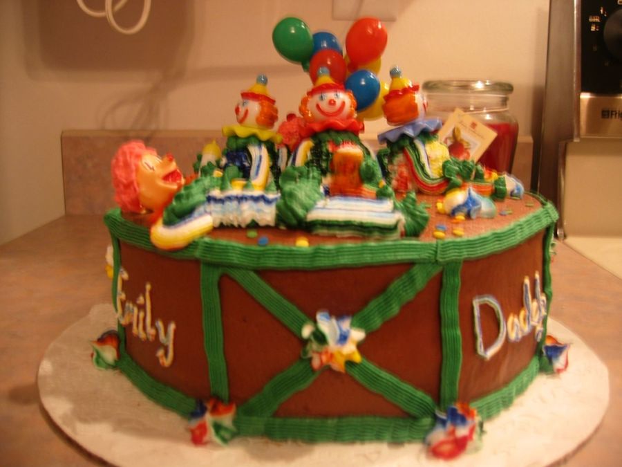 I made this cake in "Cake Decorating 101" at my local cake suppy store. I was pleased with the outcom. I enjoyed using the striping technique on the clown's bodies.