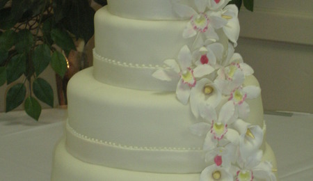 Sugar crystals over 3 tier cake with fantasy sugarflower. Cupcakes around base.