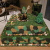 Gumpaste deer, deer blind, fondant trees, chocolate rocks. Used buttercream tutorial on here and the grass tip to break up the monotony of the camo. Layered ABC over SMBC. Cake is an 11x18 and 12x15 stacked using the SPS system with an MDF board underneath the cardboard for extra support