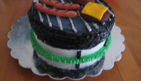 Vanilla cake wrapped in kit kat bars and topped with reeses pieces Made this for my sons school Fall Festival