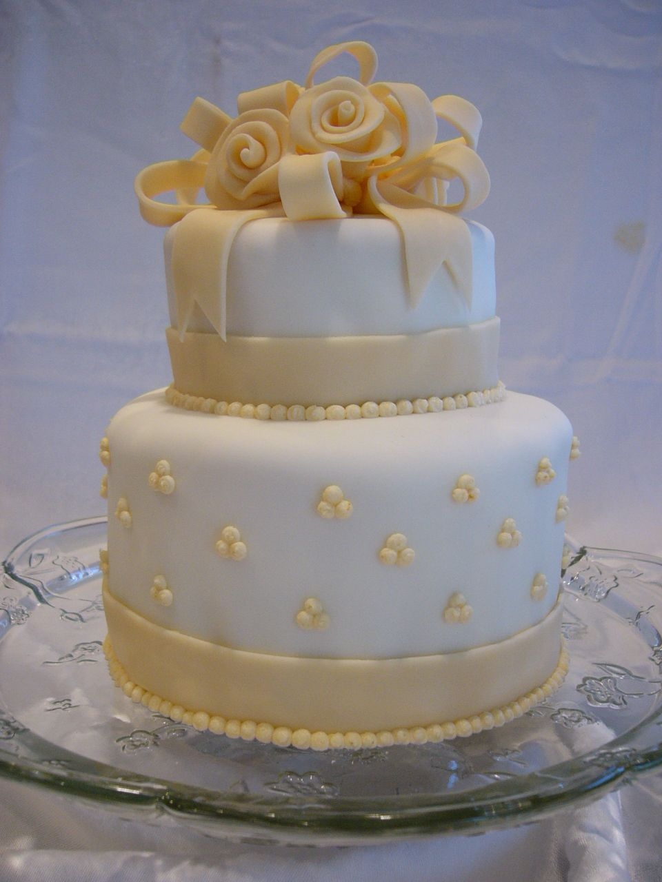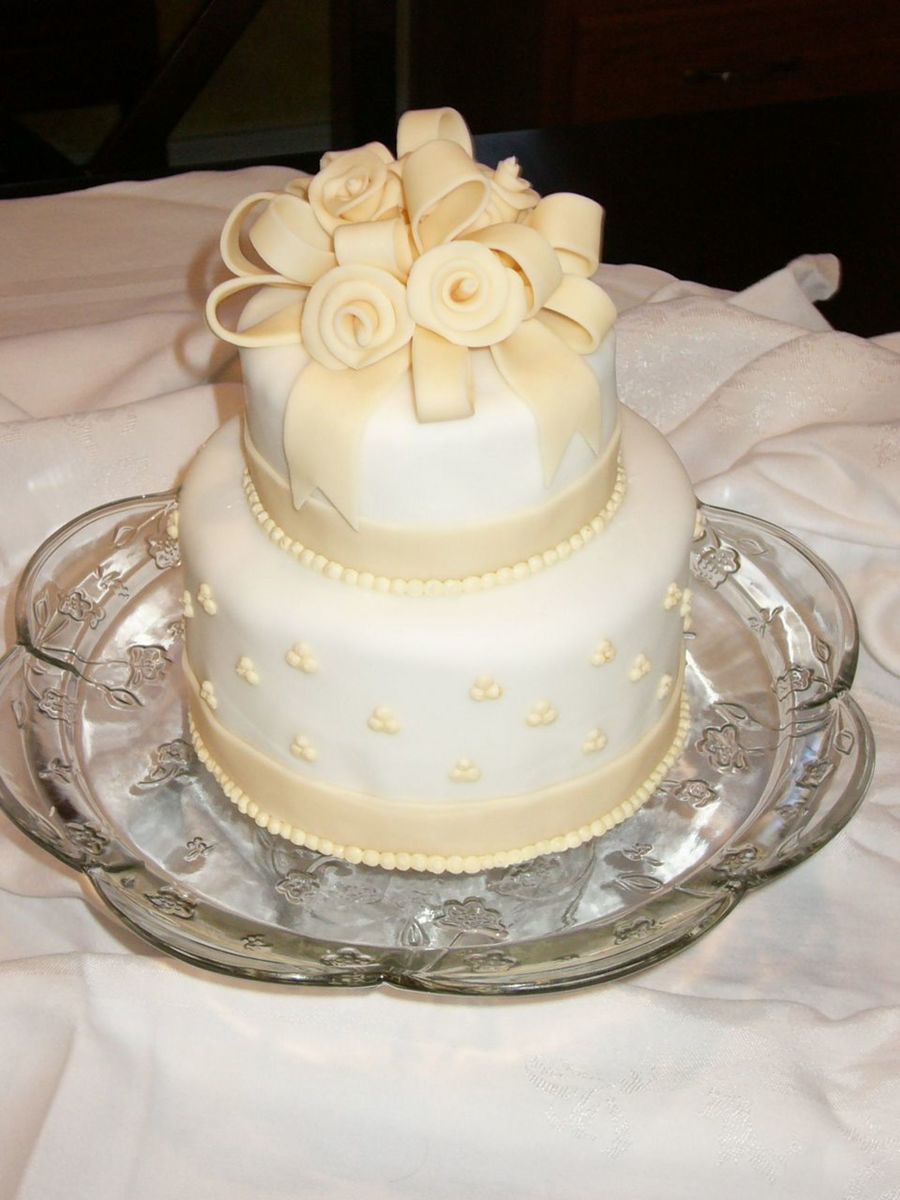 This is a practice cake I did in covering the cake in fondant. This is my first time doing ribbon roses and my second time doing fondant bows.
