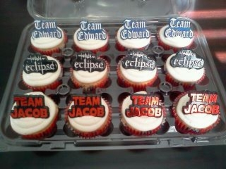 Vanilla Cupcakes w/bc frosting topped w/Team Jacob, Twilight and Team Edward rings