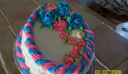 White cake with butter cream icing with royal cream icing for the flower. This cake was one of the first I have done to give out as a birthday cake. I know I need more practice on the flower but over all came out ok.