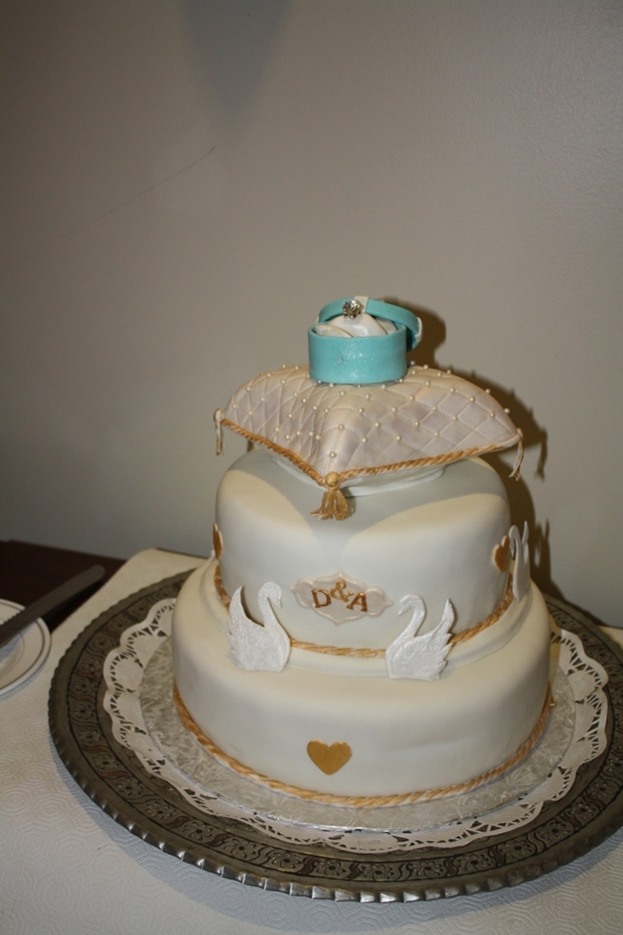 First tier an expresso cake with mocha buttercream filling. Second tier double chocolate with chocolate filling. The pillow cake was made with wilton pan..