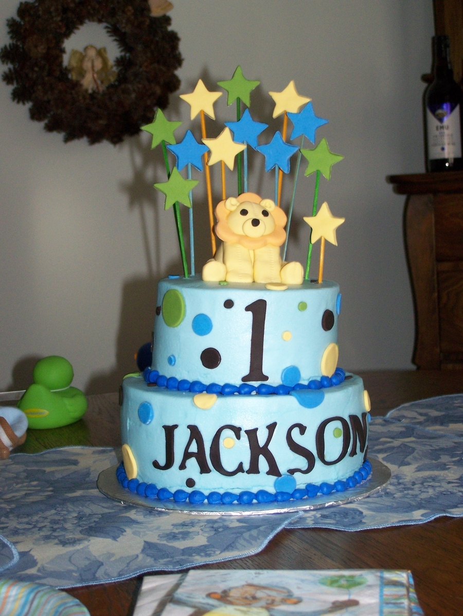 I made this one for a little boys first birthday. It was a 8 inch and 6 inch round WSAC covered with butter cream and fondant accents. The lion was also fondant.