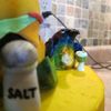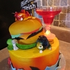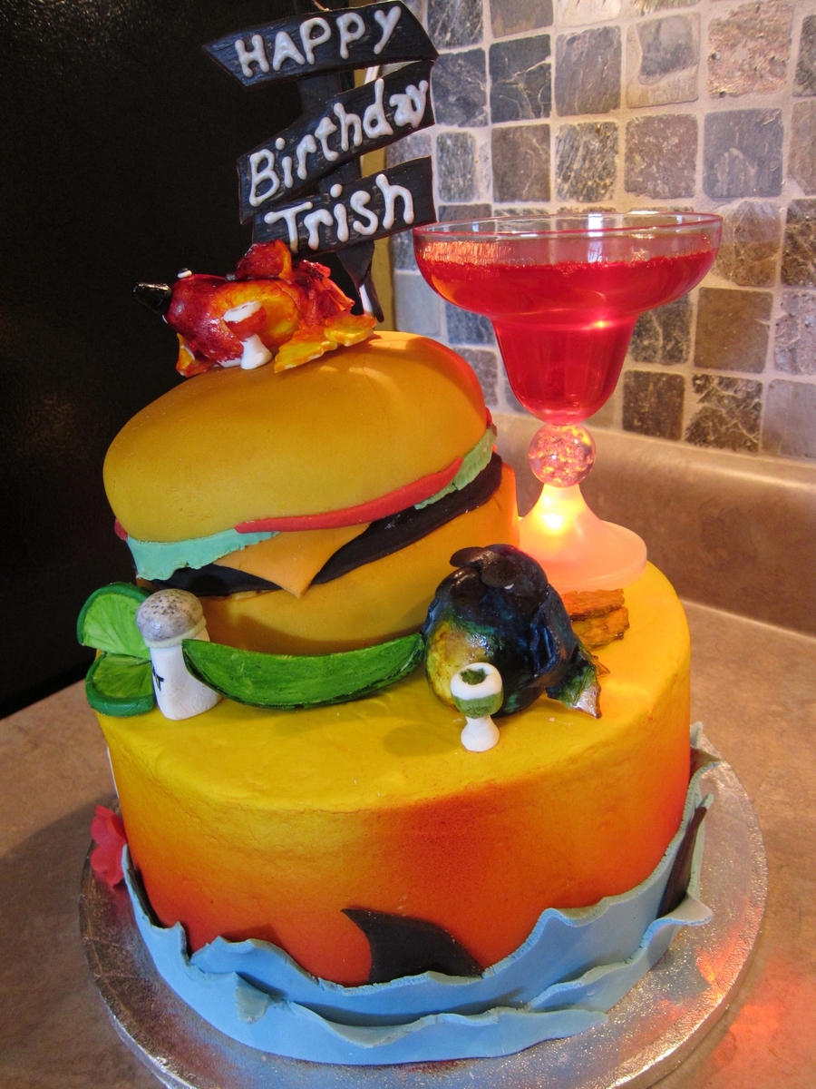 Jimmy Buffet cake cheeseburger was cake, parrots were from fondant and gumpaste mixure and painted with food coloring. Other items were from fondant bottom layer was covered in buttercream.