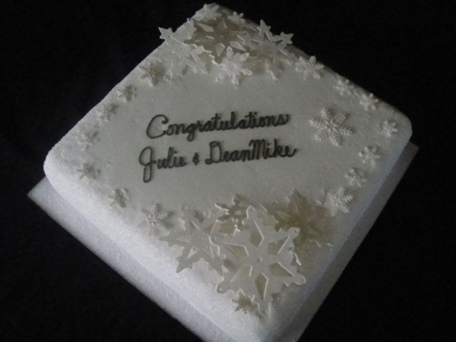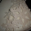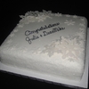 For a luncheon reception. 14" square, purposely rounded edges. BC iced with sugar crystals on the sides. Snowflakes are fondant coated in snow sparkle mystical dust. The entire top was sprinkled with the same dust to complete the snowy effect. Thanks for looking!
