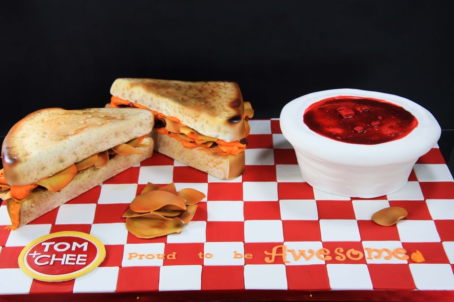 Grilled cheese cakes for celebrating a company's second anniversary. The first one is one of their award winning sandwiches--cheese, bbq chips and bacon! "Bread" was airbrushed with 7 different colors to get the layering of grilled bread.