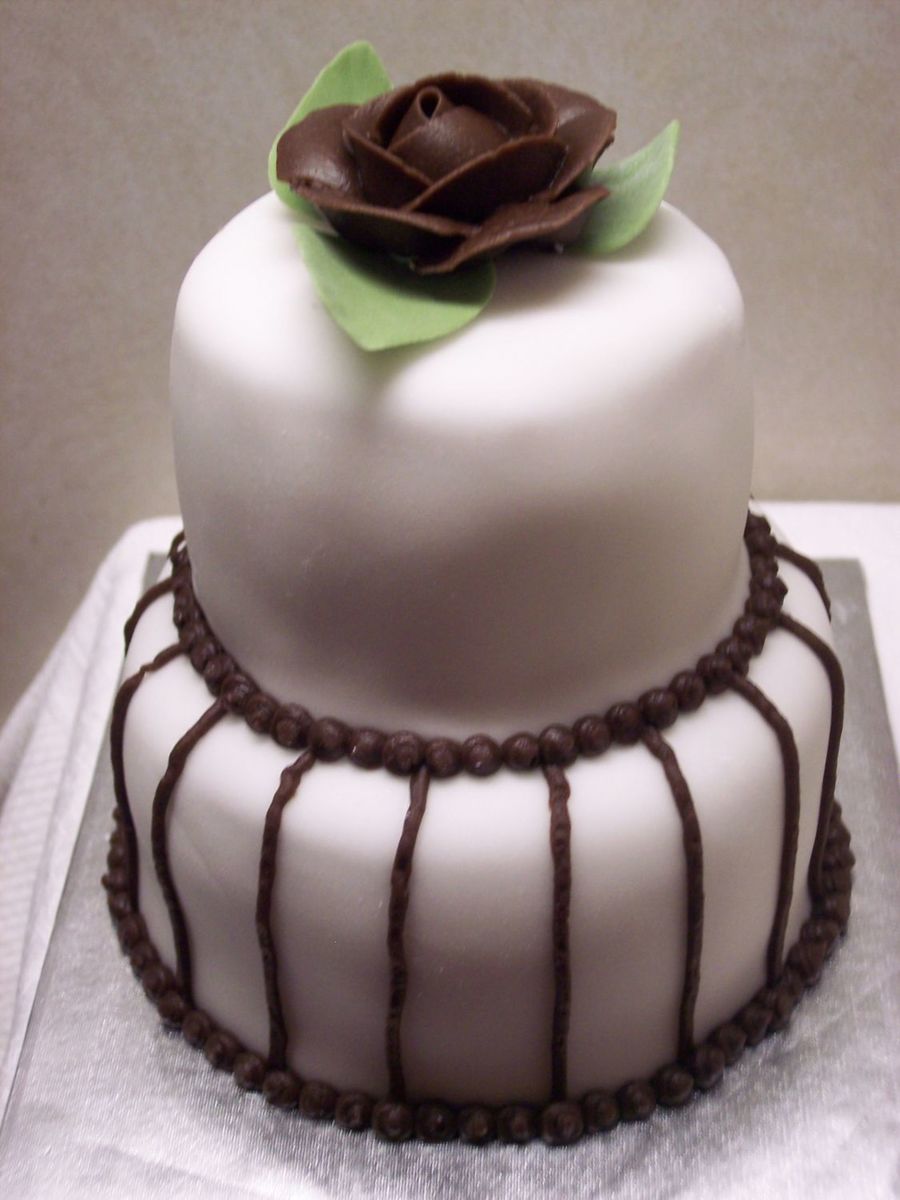 A mini cake in fondant with chocolate BC for borders and rose, fondant leaves.