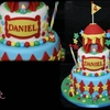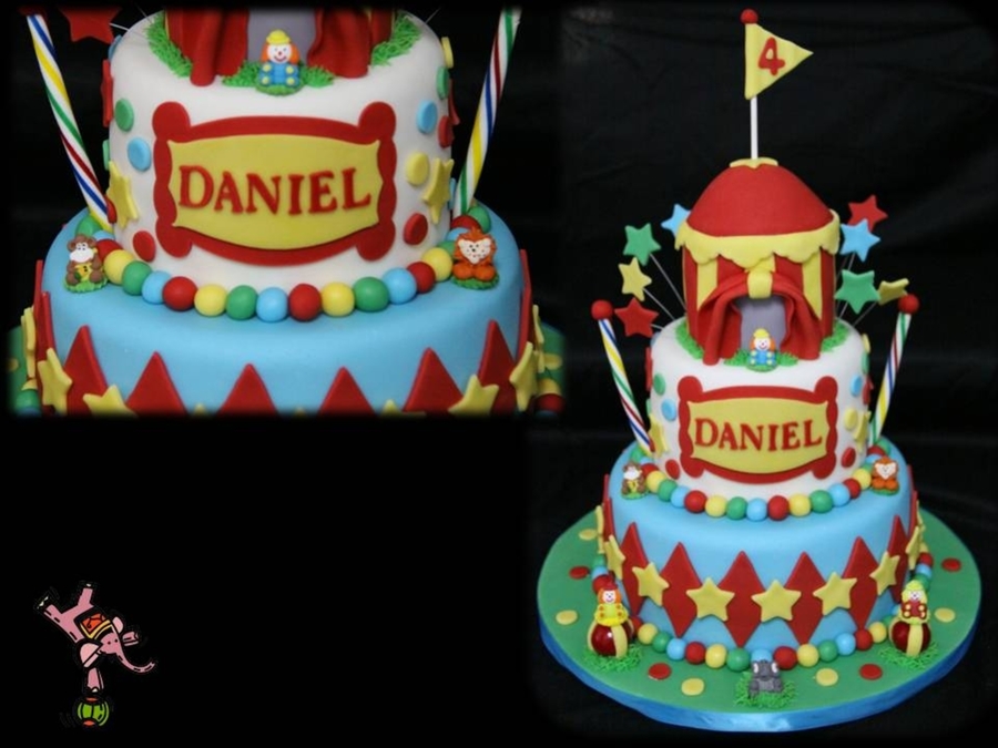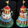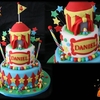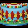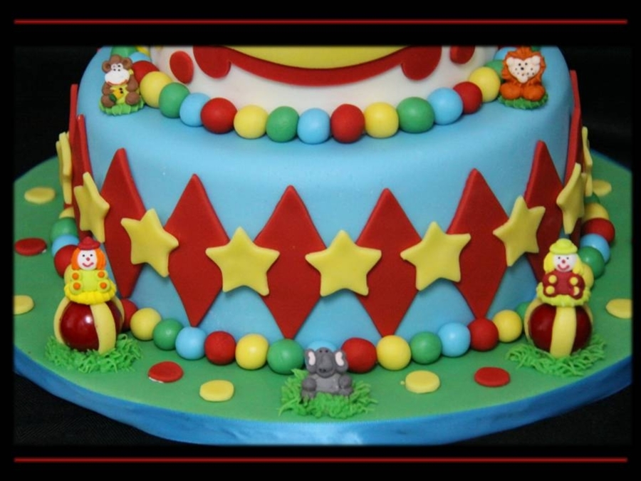 Clown Carnival themed birthday cake, all edible except for lollipop post and wires for stars.