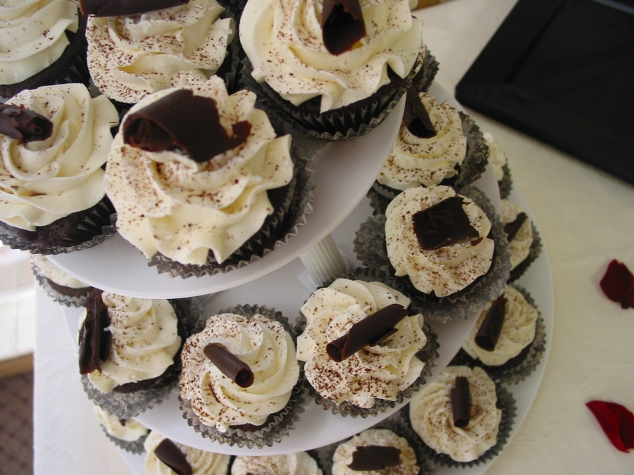 Chocolate cupcakes with Vanilla Swiss buttercream swirls and chocolate curls.