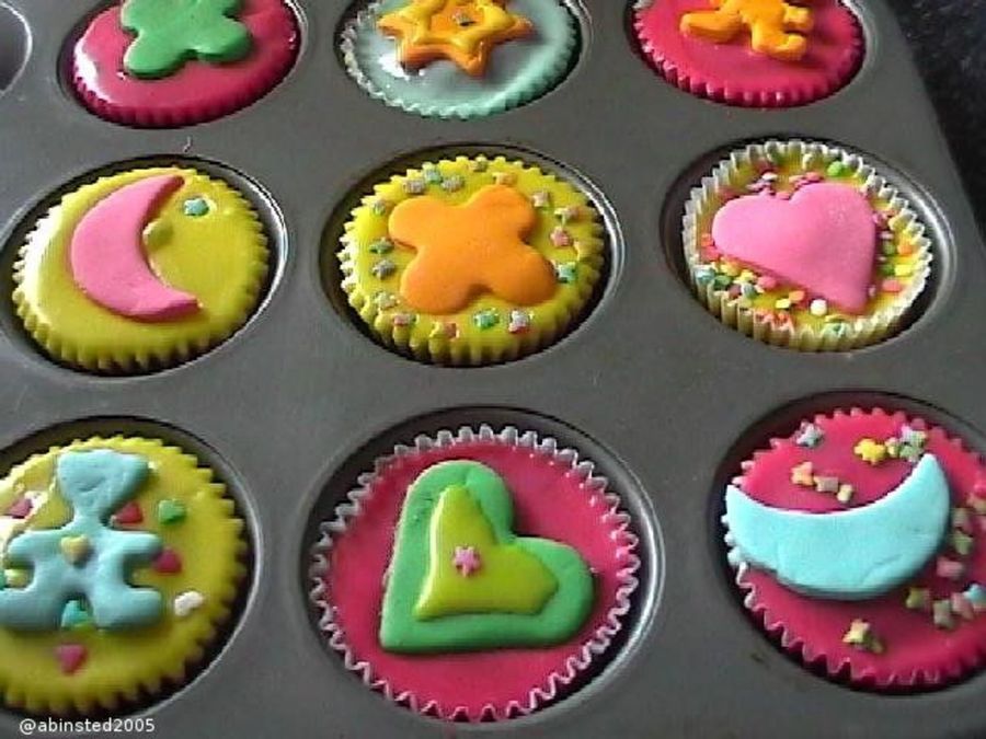 These are chocolate cupcakes. I used simple sugar icing (orange juice and icing sugar) and then topped with colored fondant cut with cookie cutters in different shapes. It's my first attempt to decorate cupcakes.
