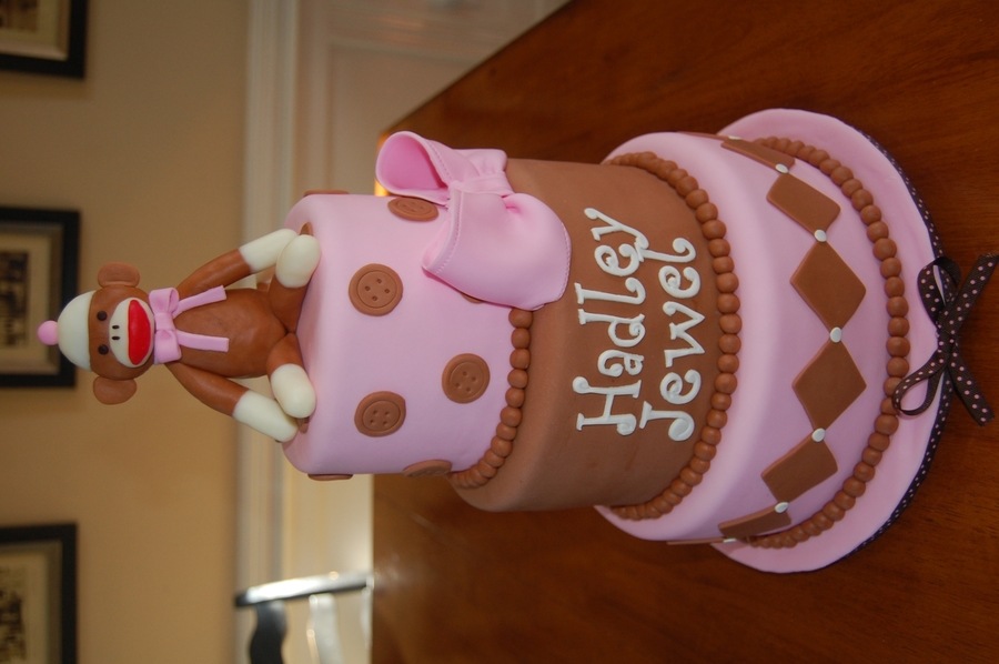 yellow cake, buttercream filling, covered in fondant. Sock monkey is white chocolate.