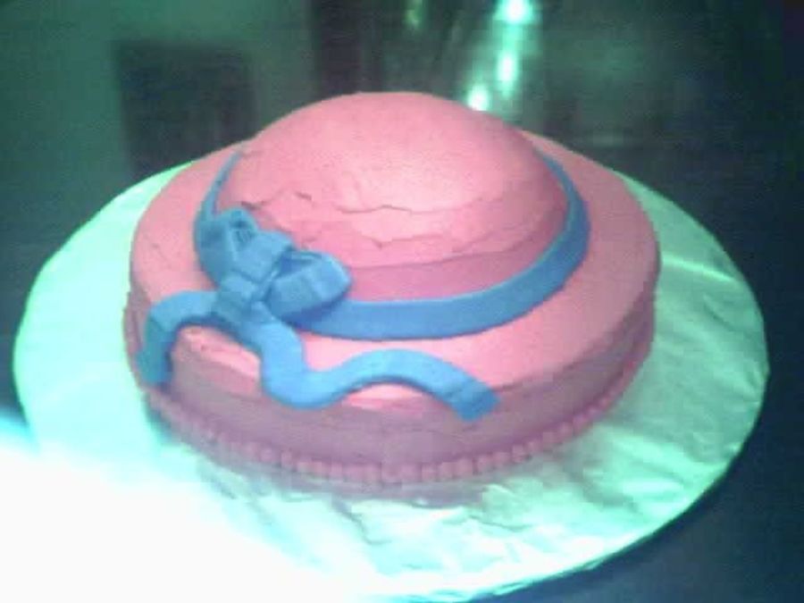 The dome of the hat was baked in round casserole dish. I can't remember what size the bottom was. It took a long time to get that red, but it still wasn't a true red. I saw how to do the bow on a website AFTER I did the cake. Oh well!! Practice makes perfect!!!
