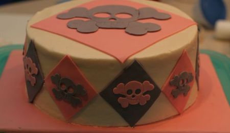 6 inch and 9 inch tiers iced in buttercream with fondant accents.
